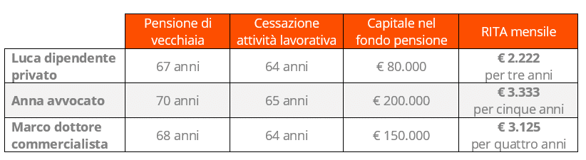 Luca è un dipendente privato che potrebbe andare in pensione di vecchiaia a 67 anni ma che ha perso il lavoro all’età di 64 anni. Grazie al capitale di 80.000 euro accumulato nel fondo pensione può contare su una RITA di più di 2.200 euro mensili per i quattro anni successivi fino al pensionamento. Anna, avvocato che dovrebbe esercitare la professione fino a 70 anni ha deciso di anticipare il pensionamento di cinque anni con la RITA. Grazie ai 200.000 euro accumulati nel fondo pensione ottiene ogni mese ben 3.333 euro. Marco, dottore commercialista, ha terminato la propria professione di quattro anni rispetto alla pensione di vecchiaia. Convertendo i 150.000 euro accumulati nel fondo pensione in RITA può contare su più di 3.100 euro mensili.