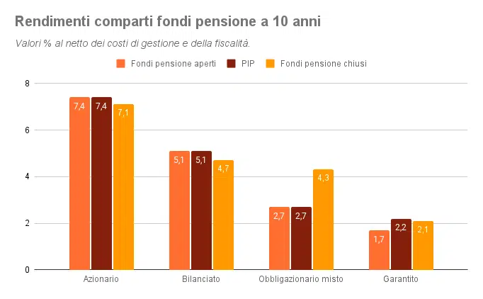 Anche su un orizzonte temporale di 10 anni spiccano inevitabilmente i rendimenti delle linee azionarie, sempre superiori al 7% in tutte le tipologie di fondi pensione.