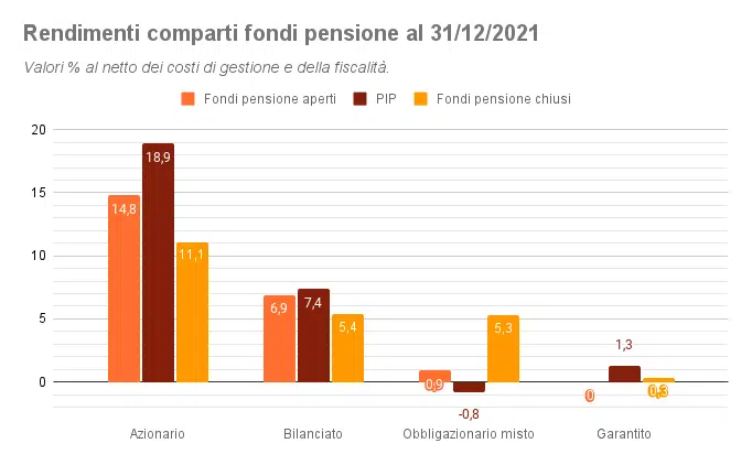Bene anche i comparti bilanciati, con il +7,4%, +6,9% e il +5,4% rispettivamente nei PIP, fondi pensione aperti e in quelli chiusi. Più contenuti, invece, i rendimenti dei comparti obbligazionari misti e dei garantiti.