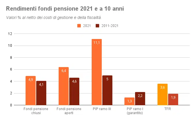 Negli ultimi dieci anni, inoltre, i rendimenti non solo sono positivi in tutte le forme pensionistiche ma sono anche superiori alla rivalutazione ordinaria del TFR lasciato in azienda, che nel 2021 è stato pari al 3,6% e negli ultimi dieci anni risulta del +1,9%.